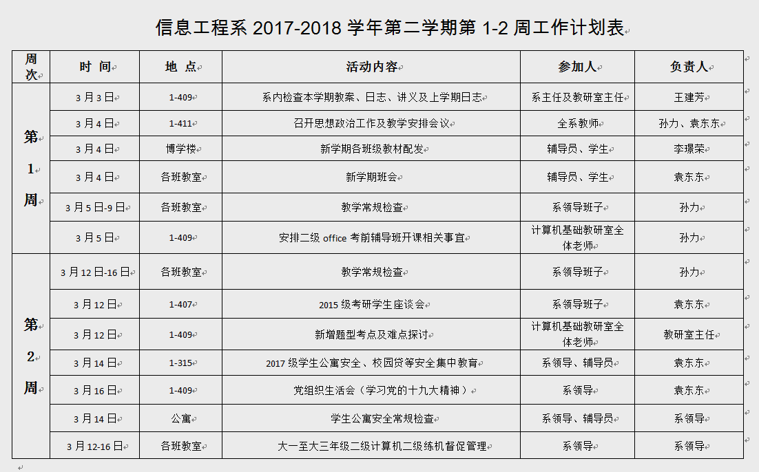 信息工程系2017-2018学年第二学期第1-2周工作计划