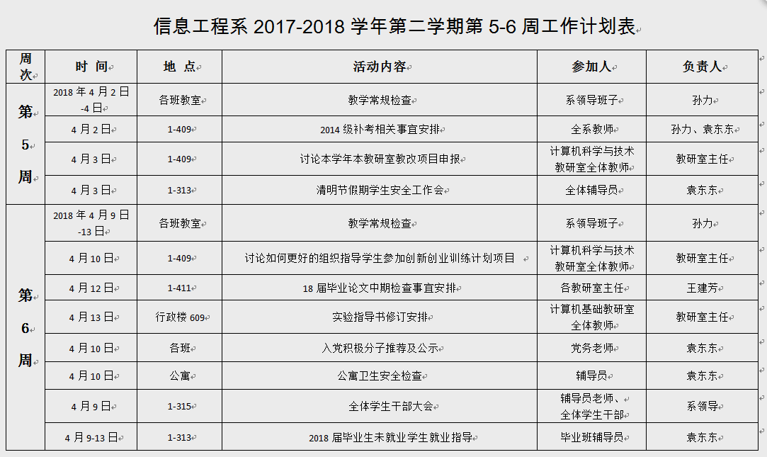 信息工程系2017-2018学年第二学期第5-6周工作计划表