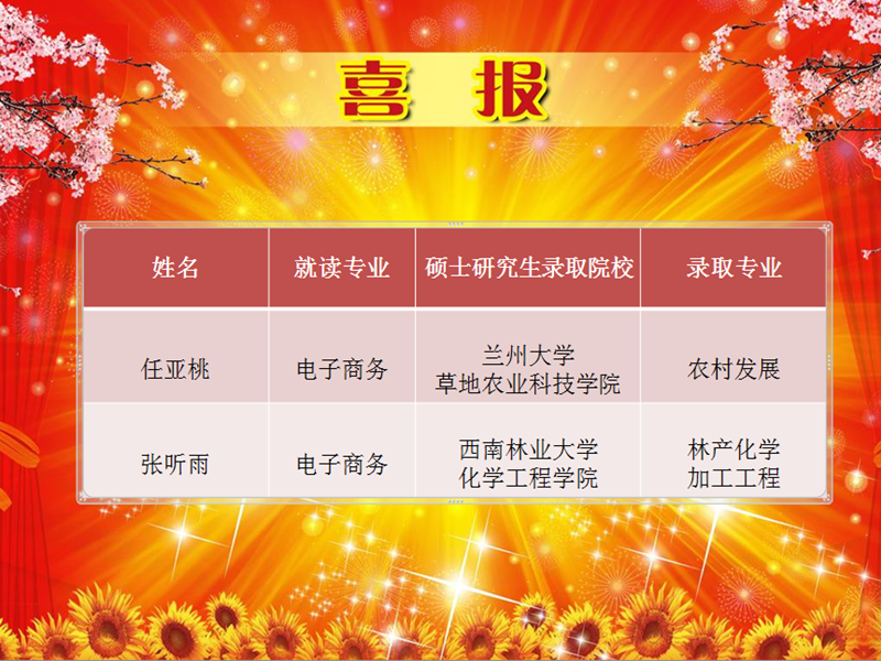 根据2018年全国硕士研究生招录复试成绩及录取结果的相继公布,信息工程系2014级电子商务班任亚桃、张听雨两名同学顺利考取硕士研究生,具体录取情况如下: