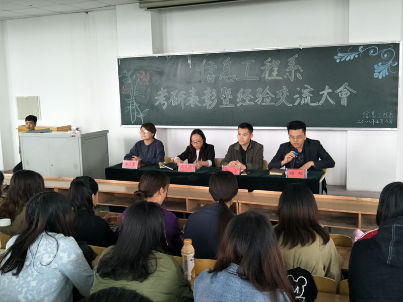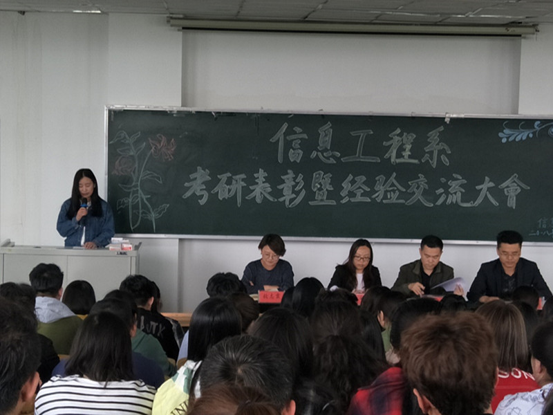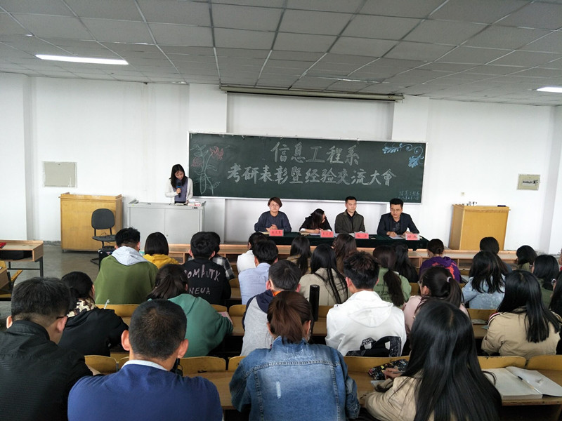 58日下午信息工程系召开了2018年考研表彰暨经验分享会,信息工程系系主任孙力、副主任王建芳、辅导员邓超、张志霞、2015级考研学生及2016级全体学生参加了会议。