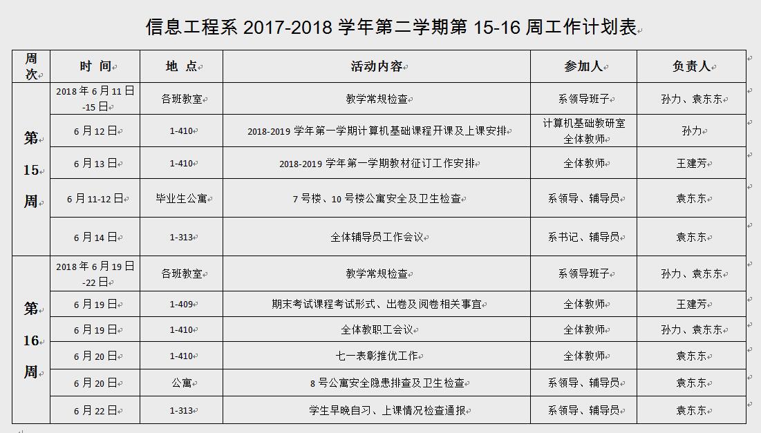 信息工程系2017-2018学年第二学期第15-16周工作计划表