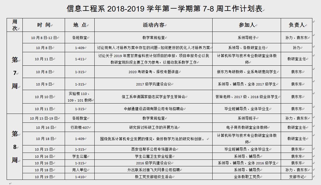 信息工程系2018-2019学年第一学期第7-8周工作计划表