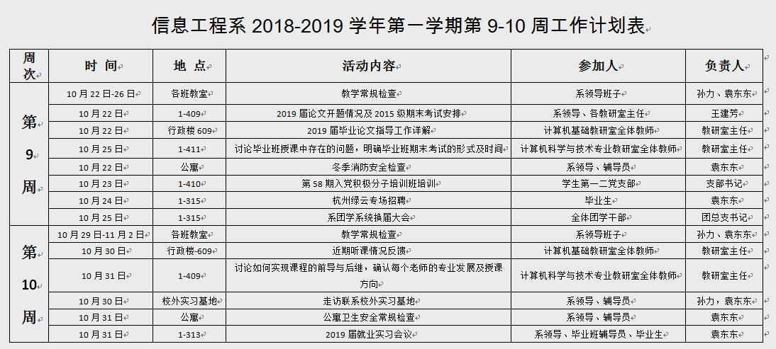 信息工程系2018-2019学年第一学期第9-10周工作计划表