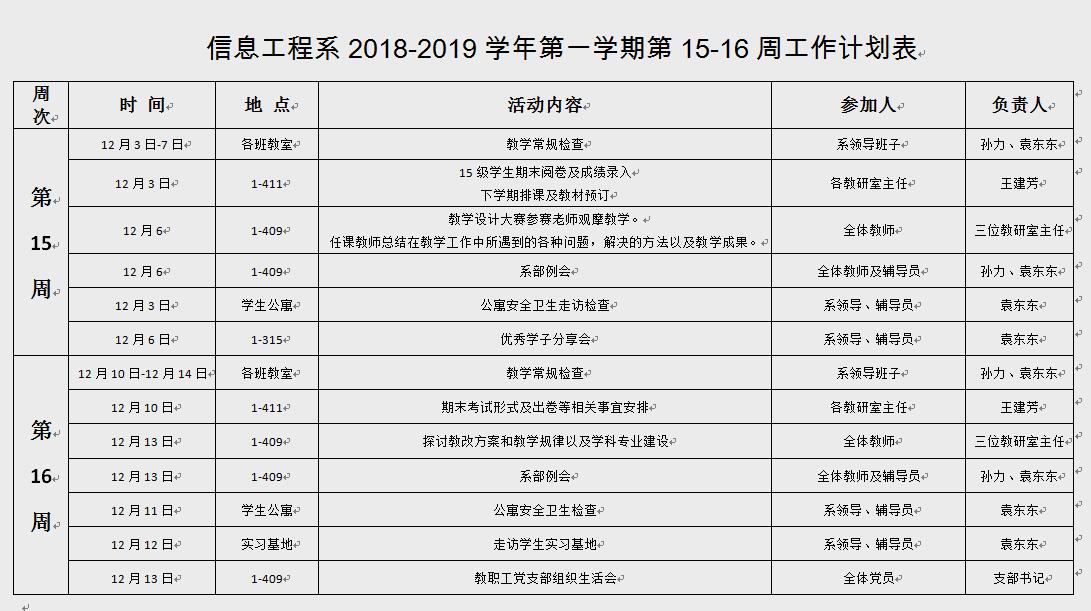 信息工程系2018-2019学年第一学期第15-16周工作计划表