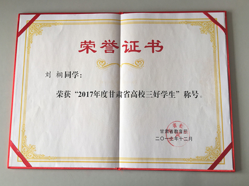 荣获2017年度甘肃省高校三好学生称号。