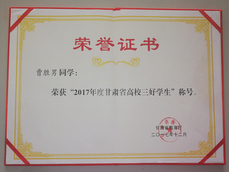 荣获2017年度甘肃省高校三好学生称号。