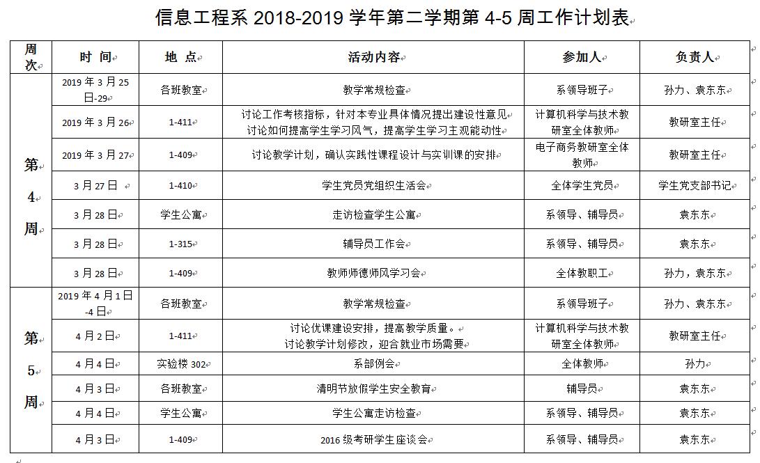 信息工程系2018-2019学年第二学期第4-5周工作计划表