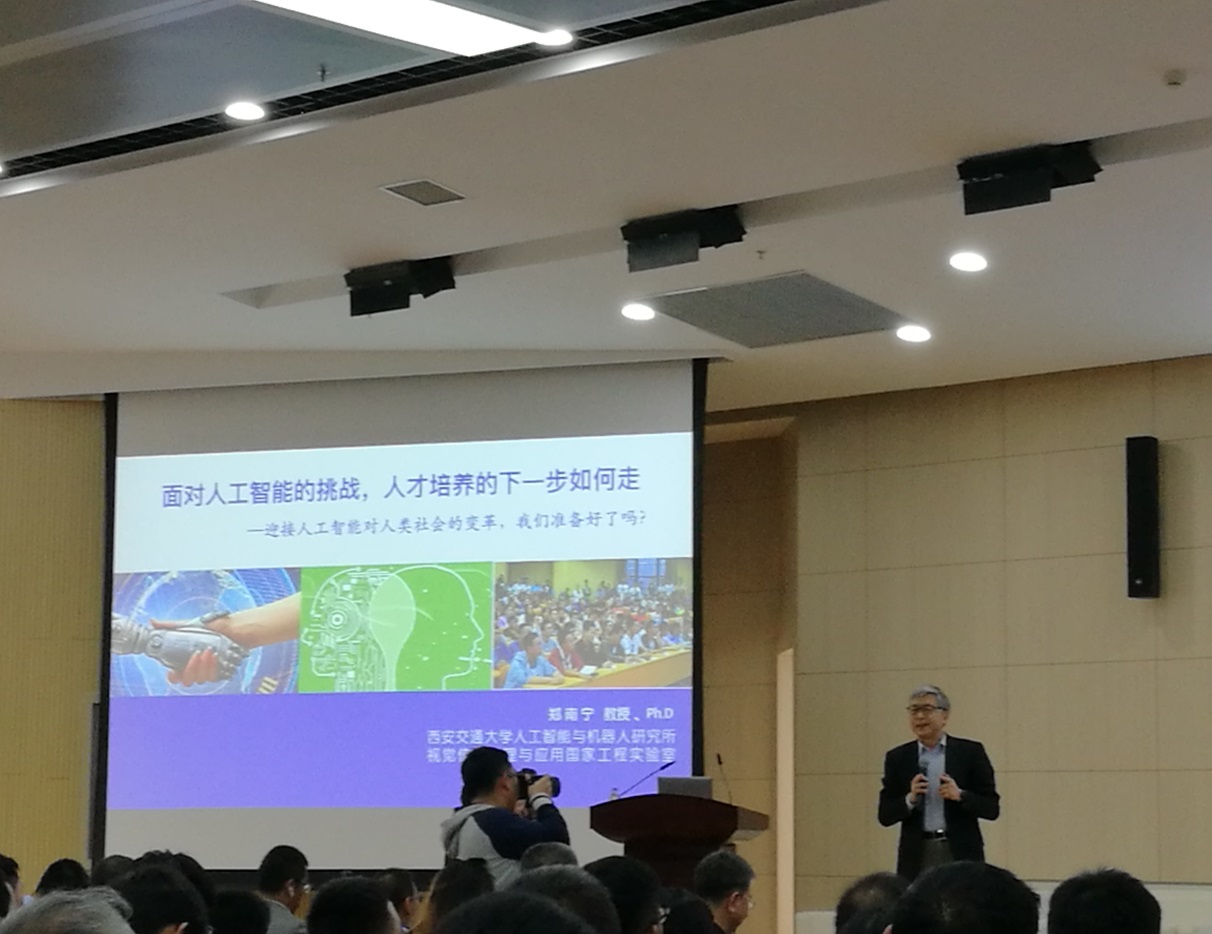中国工程院院士、西安交通大学原校长郑南宁教授做题为《面对人工智能的挑战,人才培养的下一步该如何走》的报告。他从人工智能的概念、发展阶段、模型算法与流派以及符号化人工智能的局限性谈起,并表示,要突破符号化人工智能的局限性,做到真正的“智能”,就要学习人类大脑的机能,对其进行简单分析,获得灵感,即人工智能发展要受脑认知和神经科学启发。