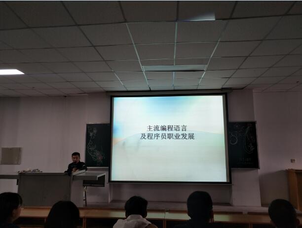 于泳海老师主要从主流编程语言、程序员职业的发展以及IT行业岗位的种类三个方面向我系在校生进行详细的介绍,讲座上同学们听的认真,台上于老师讲的仔细。