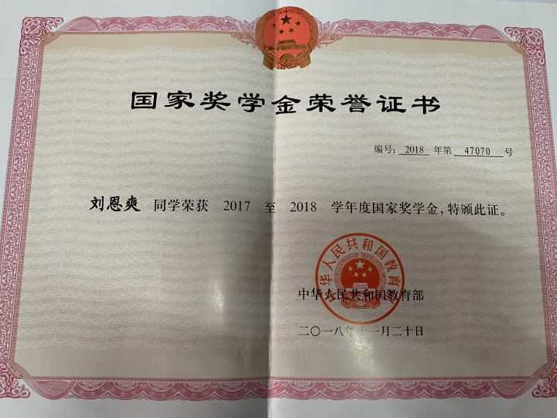本科国家奖学金的奖励标准为每人每年8000元。国家奖学金的设立体现了党和政府对学习特别优秀、家庭经济困难学生的关心和爱护,代表了国家和社会对青年大学生的鼓励与期待。希望刘恩爽同学戒骄戒躁,再接再厉,不断取得新的成绩;希望全系学生向优秀学子学习,脚踏实地,志存高远,对自己严要求、肯吃苦,努力做德智体美劳全面发展的新时代大学生。