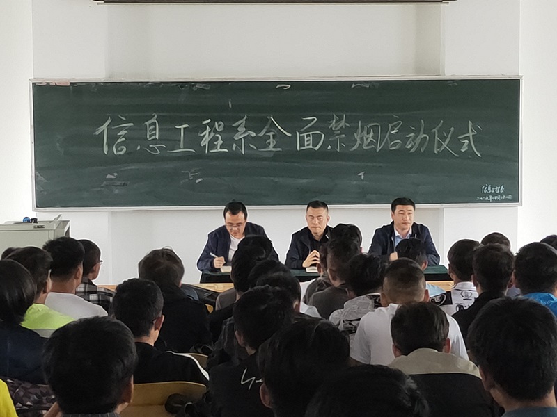 为贯彻落实教育部《关于在全国各级各类学校禁烟有关事项的通知》、《兰州市公共场所控制吸烟条例》以及《陇桥学院学生禁烟管理办法》等文件精神,切实推进文明校园、无烟校园的建设,信息工程系于4月22日下午在博学楼215召开全系校园禁烟工作启动仪式,系主任孙力、党总支书记袁东东及全系各年级男生共计210人参加了本次会议,会议由系团总支书记牛应才主持。
