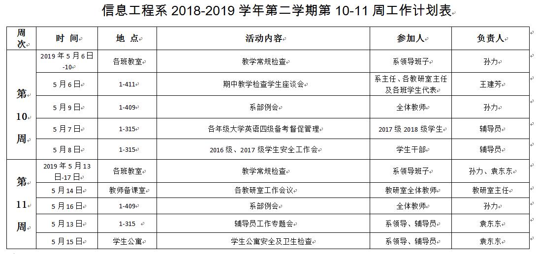 信息工程系2018-2019学年第二学期第10-11周工作计划表