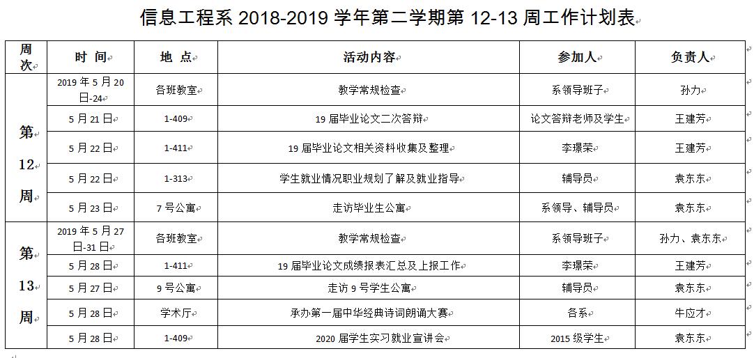 信息工程系2018-2019学年第二学期第12-13周工作计划表