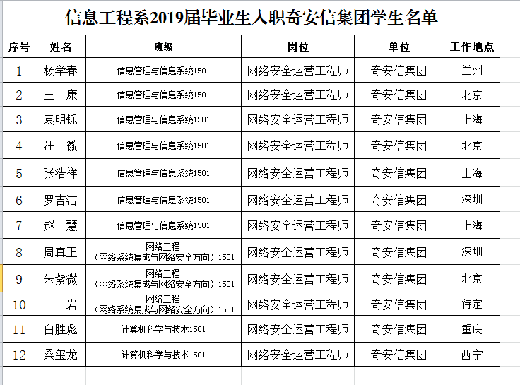 经过宣讲——笔试——面试等测评,我系12名同学进入岗前实训。在为期三个月的岗前实训过程中,我系学生表现优异,顺利通过了实训期间每月进行的实训知识测评,学生专业基础知识受到了该公司的高度肯定。2019年5月初,我系12名学生结束岗前实训,综合考核优秀,已正式签约入职奇安信集团。
