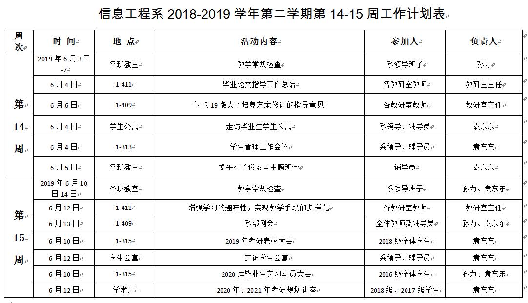 信息工程系2018-2019学年第二学期第14-15周工作计划表