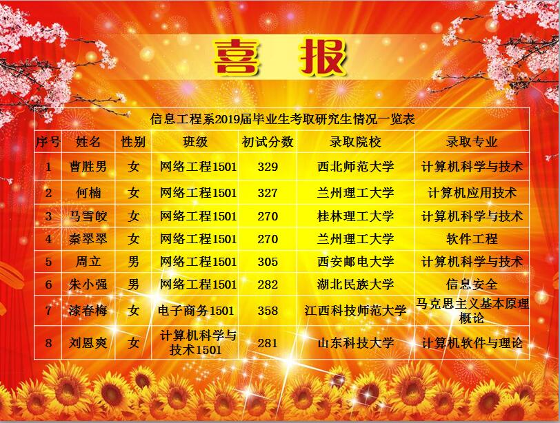 信息工程系2019届毕业生在全国硕士研究生入学考试中不负众望,取得优异成绩,共8名同学顺利考取硕士研究生。