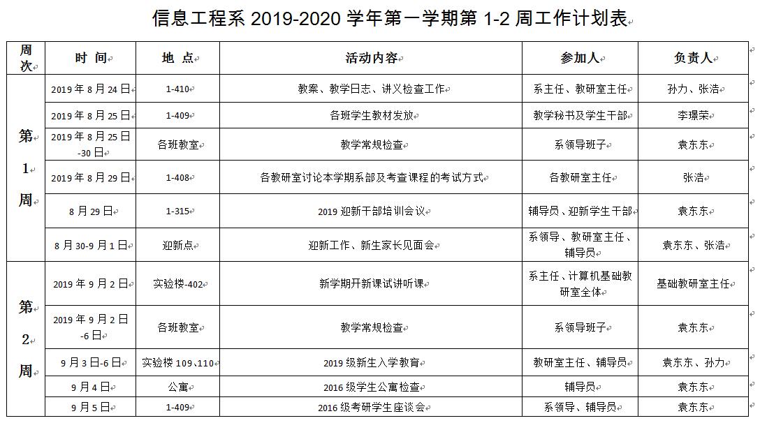 信息工程系2019-2020学年第一学期第1-2周工作计划表