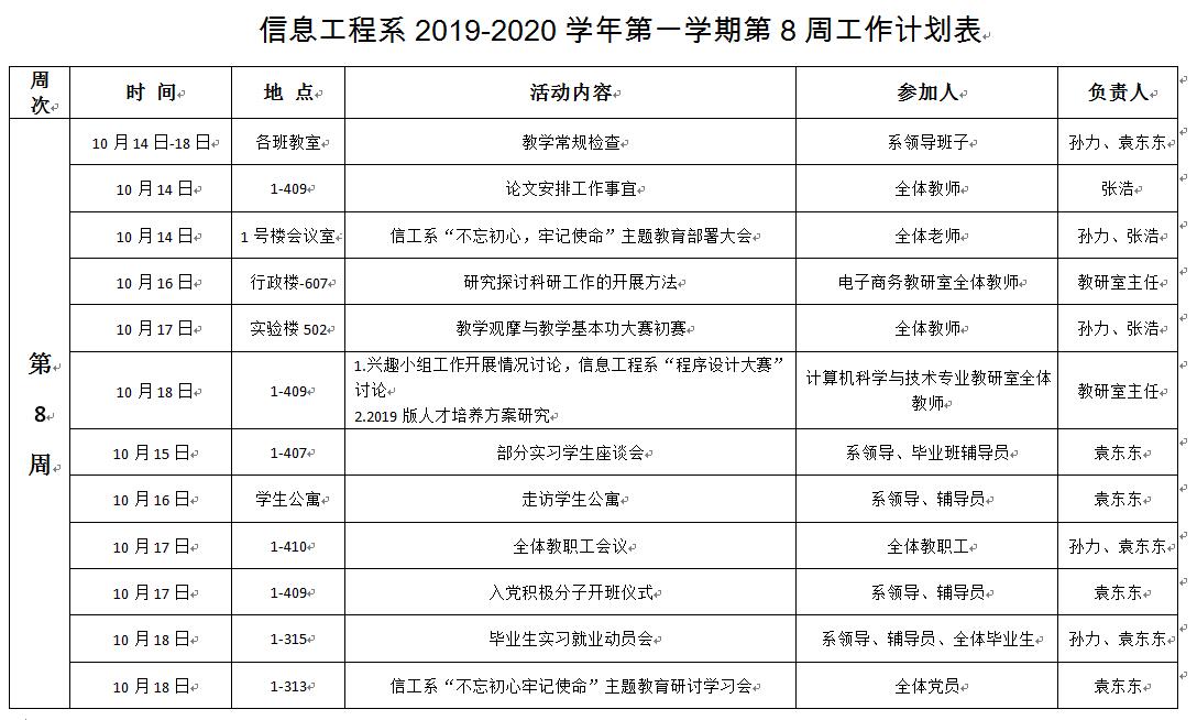 信息工程系2019-2020学年第一学期第8周工作计划表
