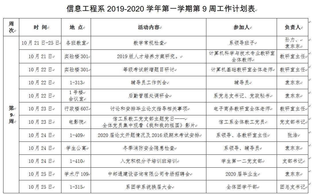 信息工程系2019-2020学年第一学期第9周工作计划表