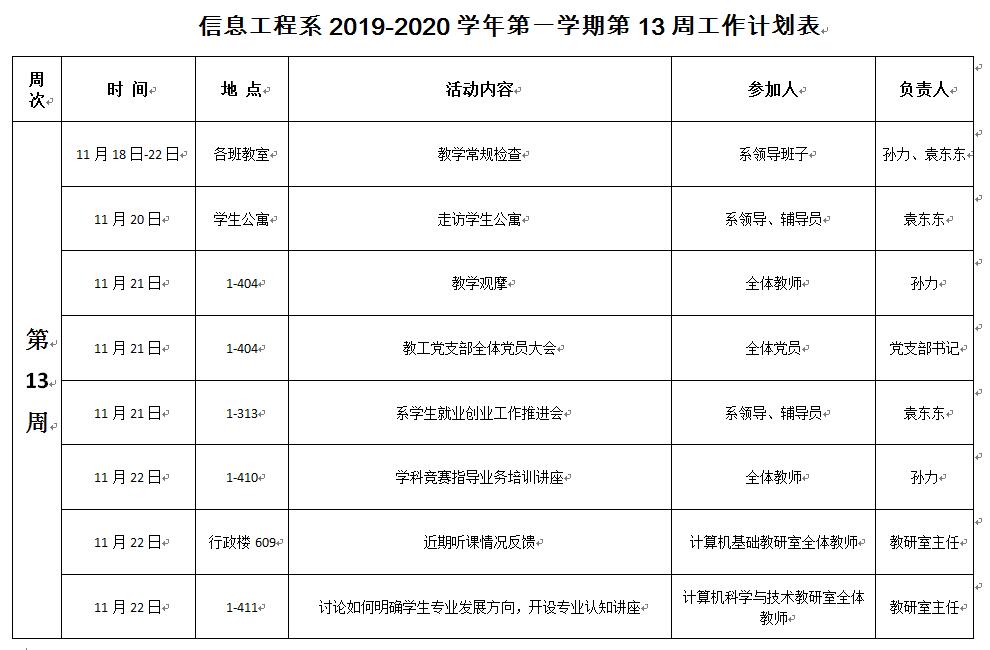 信息工程系2019-2020学年第一学期第13周工作计划表
