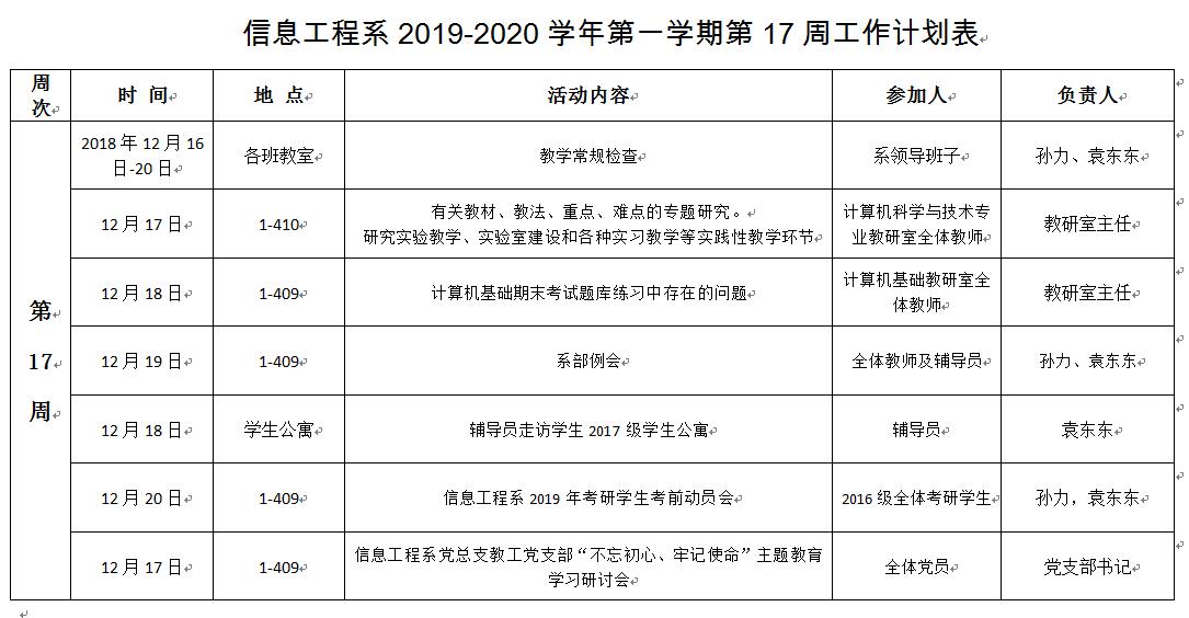 信息工程系2019-2020学年第一学期第17周工作计划表