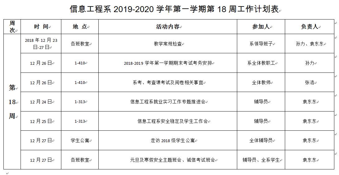 信息工程系2019-2020学年第一学期第18周工作计划表