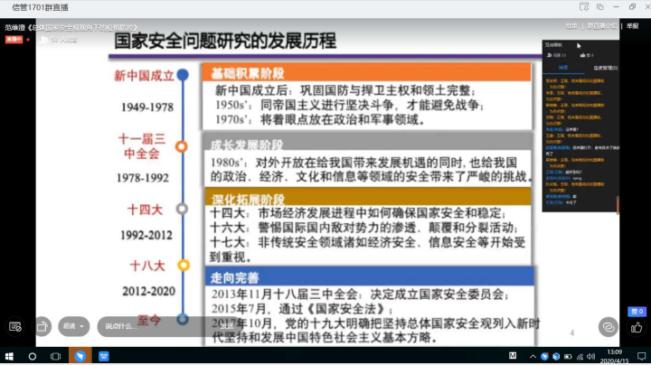 4月14日,由公共安全领域专家、中国工程院院士范维澄主讲的“总体国家安全观视角下的疫情防控”公开课,信息工程系组织全体师生通过网络收看由中国大学生在线、易班网、国家开放大学网站发布的“千万学生同上一堂国家安全教育课”。范维澄院士的精彩讲授在学生中引起了强烈反响。课后,组织学生参加国家安全知识网络答题活动,内容涉及国家安全、食品卫生、自然灾害、防疫请、防电信诈骗、防不良贷款、毒品预防等方面知识。