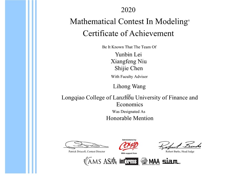 2020年美国国际大学生数学建模竞赛(MCM)成绩已经揭晓,我系2018级的雷云斌、牛向峰、陈世杰三位同学组成的团队,在经济贸易系王利红、外国语言文学系韩世霞两位老师的精心指导下,获得二等奖(Honorable Mention) 一项。这是我系学子首次参加此项赛事并斩获奖项,同时也是我院在该赛事上取得的重大突破。