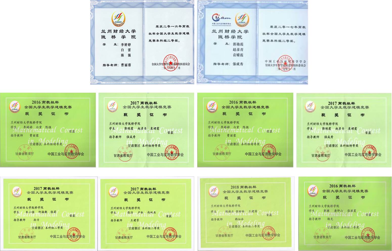 | 2016年高教社杯全国大学生数学建模竞赛 | 国家级二等奖 | 李婷婷、白云、陈强 | 曹丽蓉 | 2016.12 | 高教协会 |