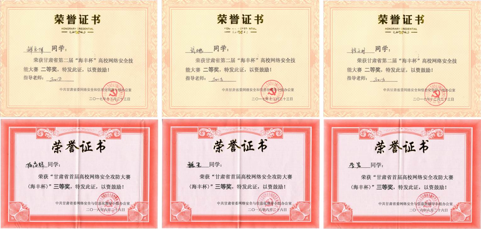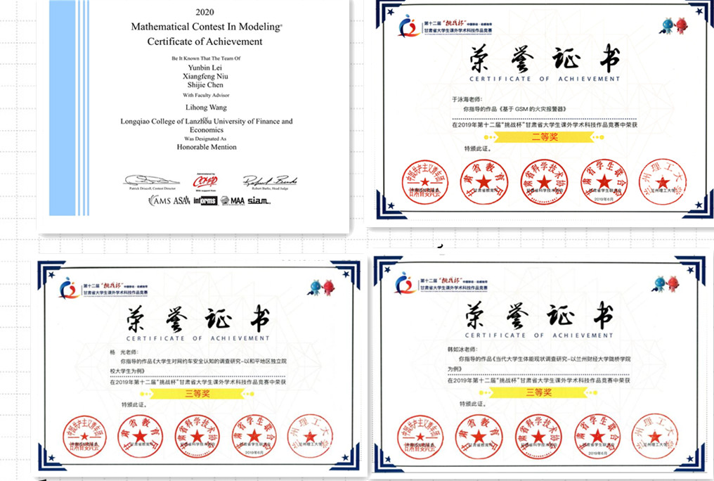 | 第十二届“挑战杯”甘肃省大学生课外学术科技作品竞赛 | 二等奖 | 范凯、付丽丽、付星宇、顾燕、高宏原 | 于泳海 | 2019.6 | 甘肃省教育厅 |
