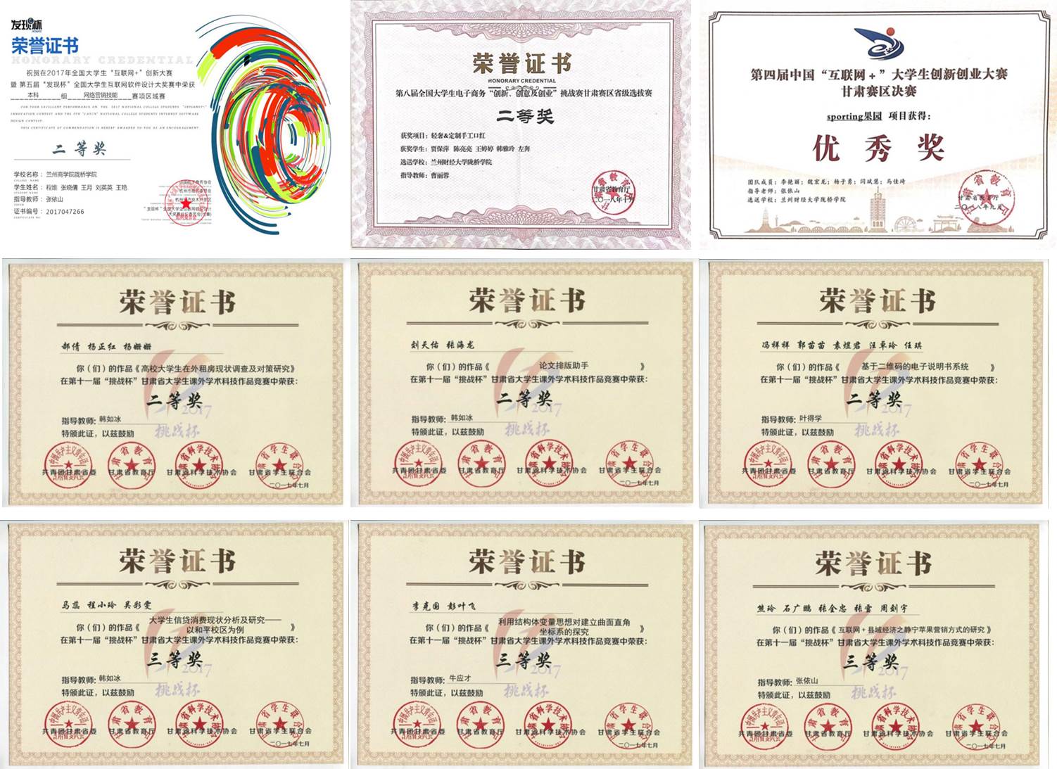 | 第四届中国“互联网+”大学生生创新创业大赛甘肃赛区 | 优胜奖 | 李艳丽 | 张依山 | 2018.9 | 甘肃省教育厅 |