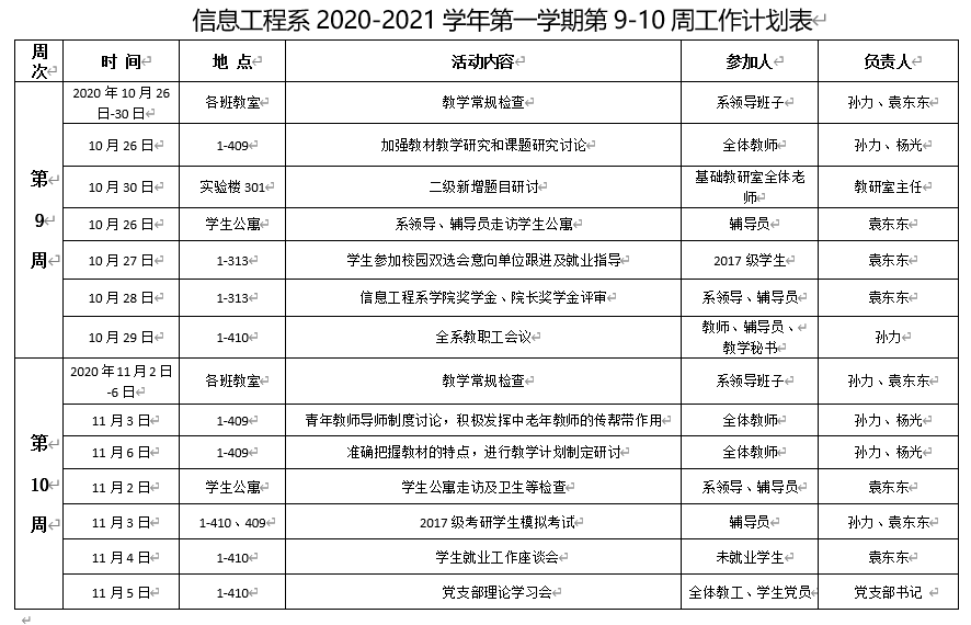 信息工程系2020-2021学年第一学期第9-10周工作计划表
