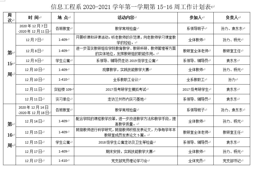 信息工程系2020-2021学年第一学期第15-16周工作计划表