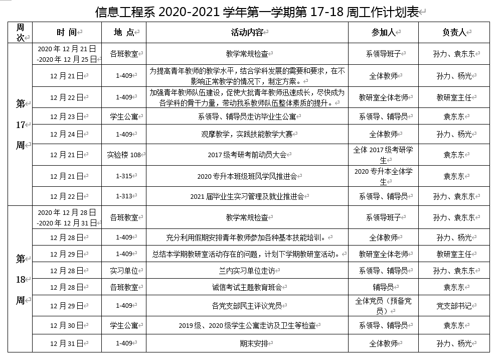信息工程系2020-2021学年第一学期第17-18周工作计划表