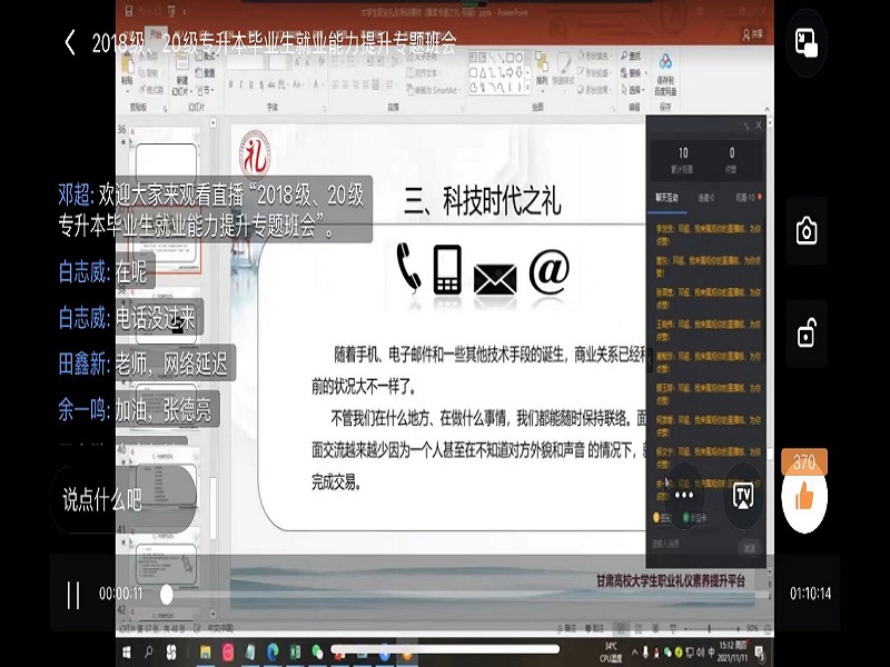 为有效指导我院毕业生积极参加线上招聘,提升线上就业能力,增强就业竞争力,尽早落实就业。1110日晚,毕业班辅导员邓超老师从职场礼仪、面试技巧、简历制作等方面对全体毕业生进行了线上就业指导。