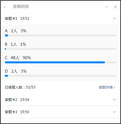 通过多种手段保持在线课堂上学生与教师的联系:如利用钉钉课堂直播提供的点名工具进行点名;在上课过程中随机抽取学生与教师连麦回答问题;让学生通过互动消息及时响应教师的问题;利用钉钉课堂直播提供的答题卡工具实施了在线答题环节,督促学生保持状态。
