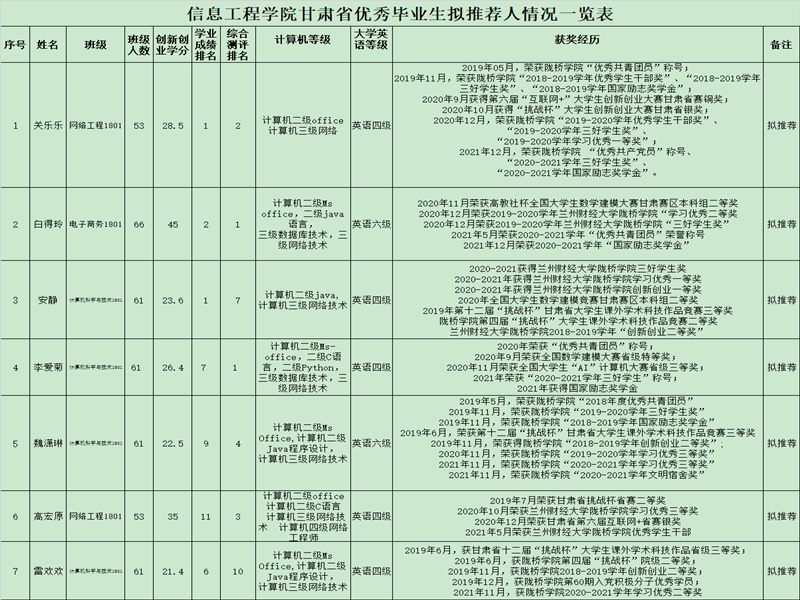 根据学校《关于做好2022届甘肃省普通高校优秀毕业生选拔推荐工作的通知》(兰工商校发〔2022〕19号)的文件要求,经各班班内推选、个人申请、学院审核评定,拟推荐关乐乐等7名学生为候选人,现予以公示,接受全院师生监督。公示期为3月10日-3月13日,公示期3天。公示期间如有意见建议可以通过来电、来信等方式反映。