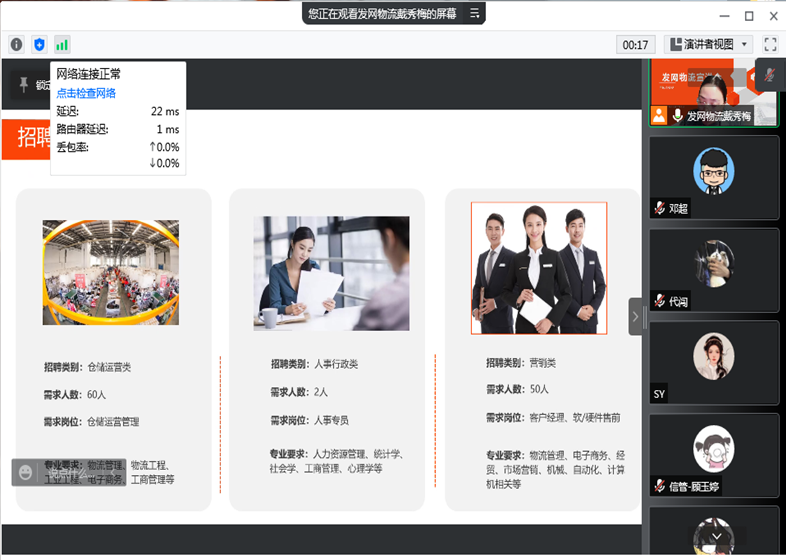 为进一步做好我院2022届毕业生就业工作,持续推进学校关于毕业生稳定、高质量就业的工作要求,同时做到疫情期间就业工作不断线,4月7日下午我院邀请到上海发网供应链管理有限公司为我院电子商务专业和信息管理与信息系统专业、工商管理学院物流管理专业学生做了专场线上宣讲会。