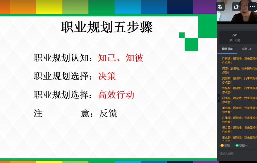 为了帮助同学们找准自身发展方向,规划未来人生蓝图,信息工程学院于4月7日下午,采用钉钉直播的形式举办学生职业规划讲座。由电子商务教研室主任殷淑娥副教授主讲,我院近百名学生聆听学习。