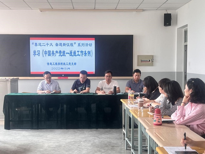 为深入学习习近平总书记关于加强和改进统一战线工作的重要指示精神,提升新时代统战工作水平,2022年9月15日,信息工程学院教工党支部召开《中国共产党统一战线工作条例》专题学习,本次专题学习会由信息工程学院教工党支部书记韩如冰主持,全体党员参会。