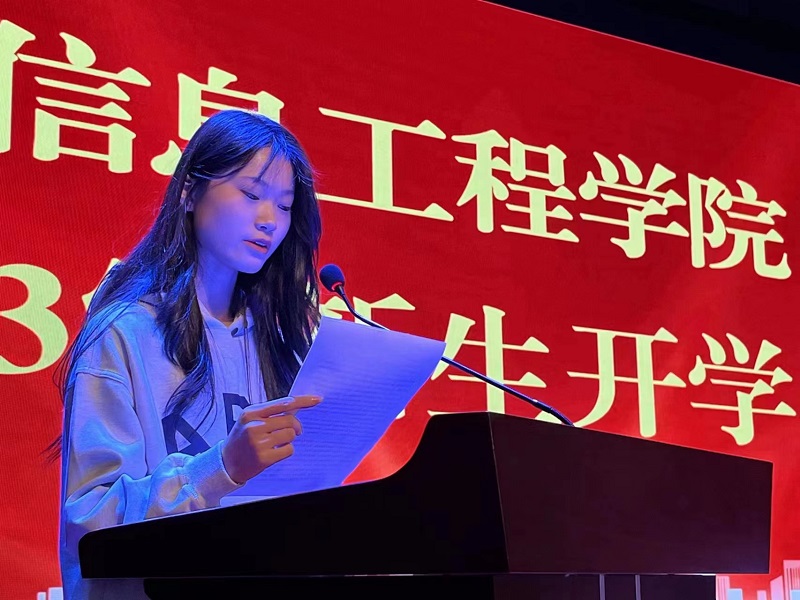 本科新生代表网络工程2301班魏湘茹同学表达了对大学生活的美好憧憬。她号召全体新生要秉承“厚德载物、博学济世”的校训,牢记领导、老师和父母的殷切嘱托,积极融入和适应大学生活,树立远大的理想志向,珍惜时光,全面提高个人综合素质和专业素养,丰富知识,完善自我。