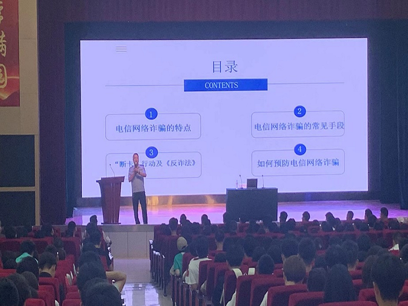 讲座现场,陈警官从电信网络诈骗的特点、常见的诈骗手段、断卡行动、如何预防电信诈骗等四个方面向同学们详细地宣传了防诈知识,结合案例深入浅出地讲解了什么是网络诈骗,现实生活中网络诈骗的识别、防范以及个人信息保护,并详细解读了网络购物诈骗、求职诈骗、“校园贷”诈骗、刷单返利诈骗、游戏充值诈骗等各类诈骗手段和特点,以真实案例剖析受害者心理特点和被骗原因。