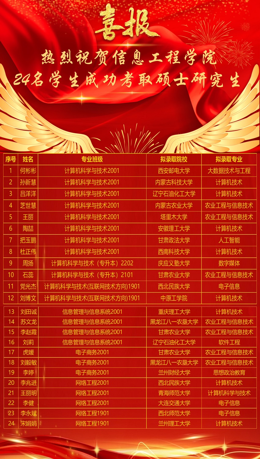 执笔为剑,披荆斩棘,历经寒窗苦读,熬过日夜兼程,尽头是花朵盛开的辽阔天空。随着2024年全国硕士研究生考试录取工作的顺利完成,我院毕业生中有24名学子分别考取西安邮电大学、西南科技大学、西安石油大学、大连交通大学、西北师范大学、甘肃农业大学、甘肃政法大学等院校硕士研究生,考研上岸率占考研学生的32%,创历年新高。在此祝贺成功上岸的学子们!