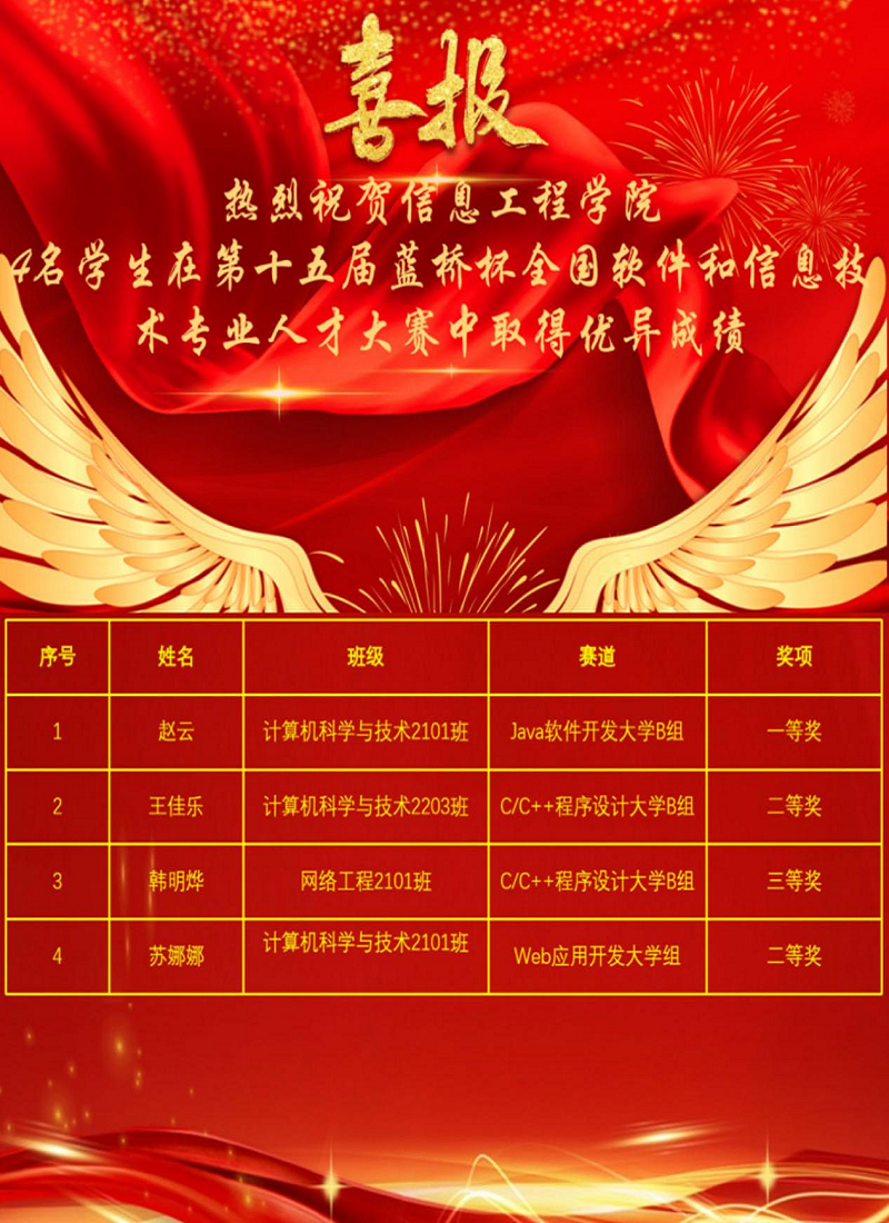 4月29日,第十五届蓝桥杯全国软件和信息技术专业人才大赛个人赛省赛(软件赛)甘肃赛区结果揭晓。信息工程学院赵云同学荣获Java软件开发大学B组一等奖;王佳乐、韩明烨同学分别荣获C/C++程序设计大学B组二等奖和三等奖;苏娜娜同学荣获Web应用开发大学组二等奖。其中,赵云同学将代表甘肃赛区参加全国决赛。