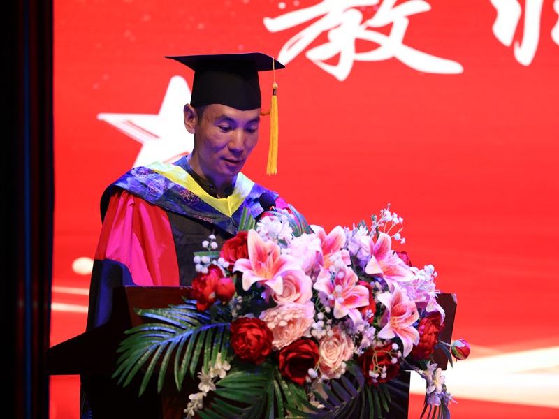 接着,教师代表于泳海教授向顺利完成学业的毕业生表示热烈祝贺,并勉励毕业生坚持主动学习,做到“苟日新,日日新,又日新”,同时从容应对各种困难和挫折,等待时机,积蓄力量,踏踏实实做好规划,厚积薄发,一鸣惊人。毕业生代表苏文龙同学在发言中对学校、学院的倾心培养表达深深地感谢,并号召同学们厚植爱国情怀,以永不熄灭的青春热忱,奋力书写为中国式现代化挺膺担当的青春篇章。