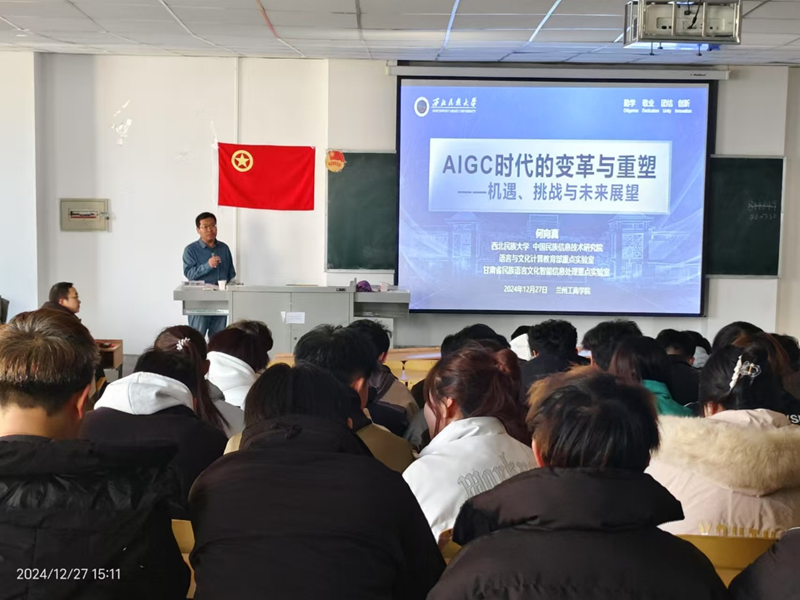 2024年12月27日,信息工程学院特邀西北民族大学中国民族信息技术研究院副院长何向真教授,就“AIGC时代的变革与重塑”这一主题进行了精彩讲座。此次讲座分为两部分,深度解析了人工智能的发展、AIGC的影响以及西北民族大学中国民族信息技术研究院的教育与研究现状。