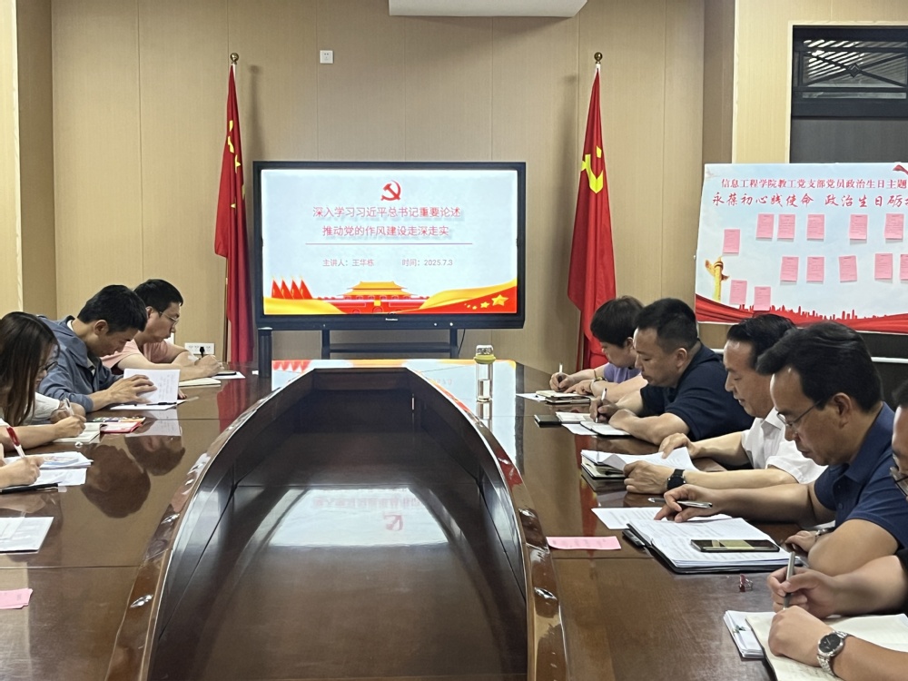 2025 年7月3日下午,校长王华栋以“深入学习习近平总书记重要论述,推动党的作风建设走深走实”为主题,为信息工程学院全体教工党员讲授专题党课,强调深化党的作风建设的重要性。