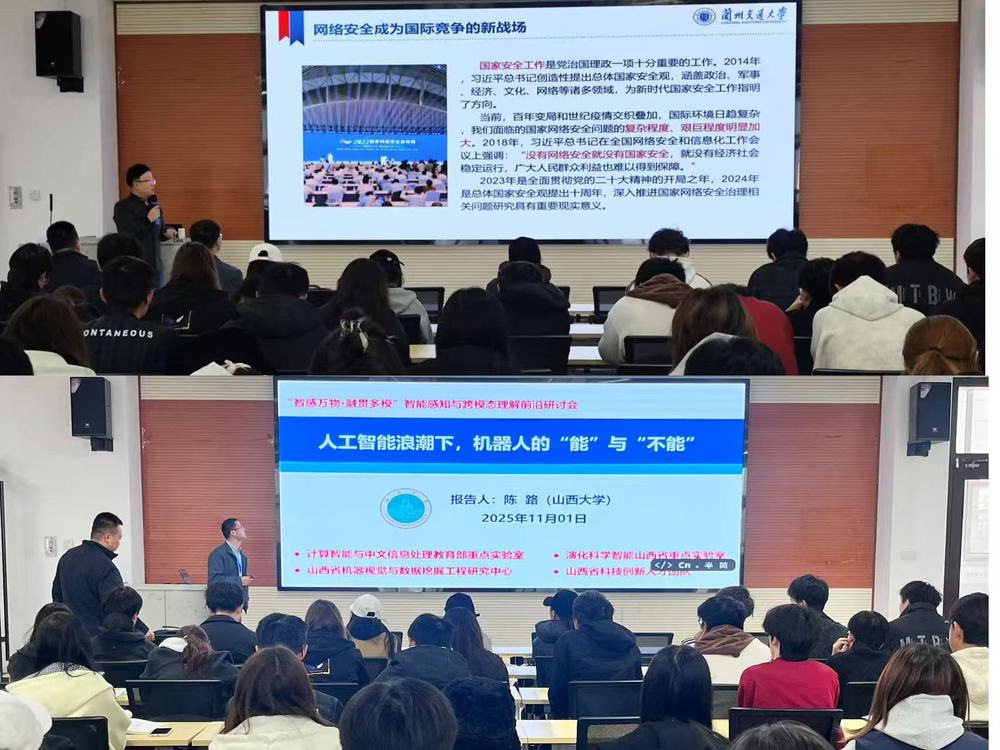 学生会场,山西大学陈路教授围绕《人工智能浪潮下,机器人的 “能” 与 “不能”》展开分析,探讨智能技术的能力边界与伦理约束,兰州交通大学火久元教授以《信息安全相关前沿新技术》为题,解读多模态数据传输中的风险防控策略。同学们纷纷表示:“关于机器人能力边界与伦理约束的讲解,打破了我们对人工智能‘无所不能’的固有认知,让我们意识到技术发展必须坚守伦理底线,信息安全前沿技术,把抽象的风险防控知识和多模态数据传输的实际场景结合起来,让我们清晰看到专业知识在行业中的应用价值。讲座不仅拓宽了我们的学术视野,更让我们明确了未来学习中‘技术能力’与‘责任意识’并重的重要性,也激发了我们深入研究相关领域的兴趣。”