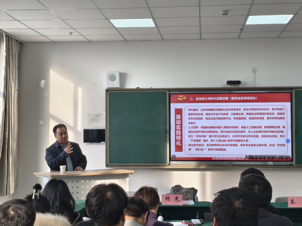 宣讲会上,康校长以“深学全会精神、勇担育人使命”为主题,详细介绍了党的二十届四中全会的基本情况与重大意义,并重点解读了全会关于信息领域科技创新、数字中国建设等方面的战略部署,结合学院学科特色与发展实际,对全会精神进行了系统解读和深入阐述,他强调,这些部署与信息工程学院在人工智能、网络安全等核心学科方向高度契合,为学院进一步优化学科布局、深化人才培养、强化科研攻关提供了根本遵循和行动指南,学院应主动对接国家战略,紧密服务区域发展,将全会精神转化为推动学院高质量发展的强大动力。