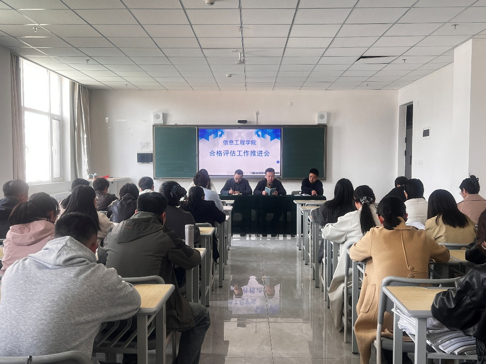 为进一步规范教学常规管理,扎实推进本科教学工作合格评估整改落实,周密部署预评估各项准备工作,统筹做好外聘教师资料管理与教学经费保障,2026 年 4 月 2 日,信息工程学院在综合教学楼 A609 会议室召开教学常规工作与合格评估工作专题会议。会议由学院教学院长杨光主持、教学副院长叶得学、教学助理陈名芳及学院全体教职工参加会议。